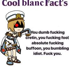 Blanc's favorite word is "fuck." Her 2nd favorite word is "hell." Her 3rd favorite word is "ass." Her favorite food is tangerines. Blanc hates Vert, Vert's boobs, Vert's attitude, Vert's country, the color green, and Vert. Her favorite drink is Rolling Rock. She has a secret fetish for mustachioed men, and hates that hedgehog. Please understand.
